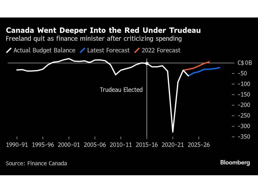 Former Finance Minister Chrystia Freeland precipitated Trudeau’s exit with her stinging resignation letter in December that accused him of failing to keep the “fiscal powder dry” ahead of a trade war with the US. Now that the tariff fight is underway, the government is under significant pressure to spend on programs to support businesses and workers.