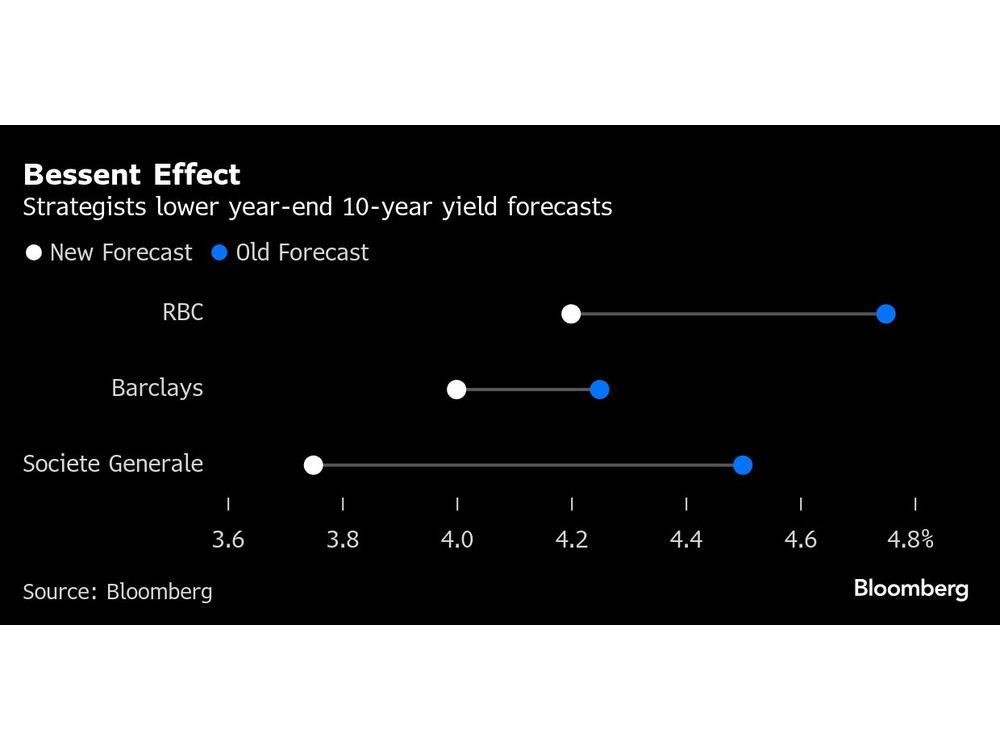 Dalam beberapa minggu terakhir, kepala ahli strategi tingkat di Barclays, Royal Bank of Canada dan Societe Generale telah memotong perkiraan akhir tahun mereka selama 10 tahun hasilnya sebagian, kata mereka, karena kampanye Bessent untuk mendorong mereka lebih rendah. Ini bukan hanya rahang, tambah mereka, tetapi fakta bahwa Bessent dapat menindaklanjutinya dengan tindakan konkret seperti membatasi ukuran lelang utang 10 tahun atau mengadvokasi peraturan bank yang lebih longgar untuk meningkatkan permintaan obligasi atau mendukung kampanye panik Elon Musk untuk memotong defisit anggaran.