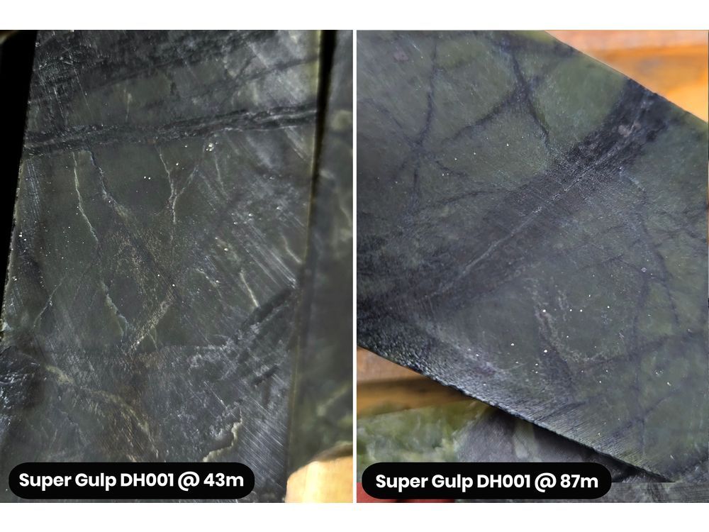 Super Gulp Drill Hole 1 (AN-24-01) showing disseminated sulfur-free-nickel (awaruite) in serpentinized ultramafic rock, with serpentine-magnetite fracture filling and veinlets at 43m and 87m downhole.Super Gulp Drill Hole 1 (AN-24-01) showing disseminated sulfur-free-nickel (awaruite) in serpentinized ultramafic rock, with serpentine-magnetite fracture filling and veinlets at 43m and 87m downhole. GNW