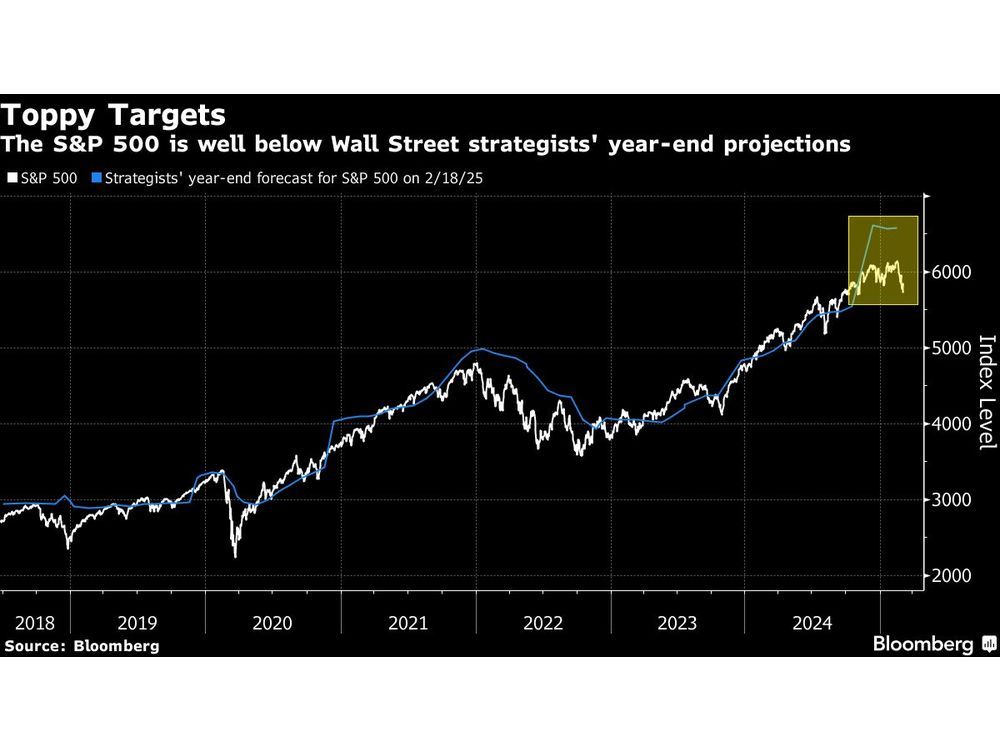 Awal yang bergejolak hingga 2025 memiliki peramal Wall Street memikirkan kembali prediksi bullish mereka untuk stok pada awal tahun. Target rata -rata yang diprediksi oleh survei dua lusin ahli strategi memperkirakan bahwa S&P 500 akan berakhir 2025 pada 6.511,36, berdasarkan data yang dikumpulkan oleh Bloomberg. Itu menyiratkan kenaikan sekitar 13% dari penutupan hari Jumat untuk tolok ukur yang sudah turun sekitar 2% untuk tahun ini.