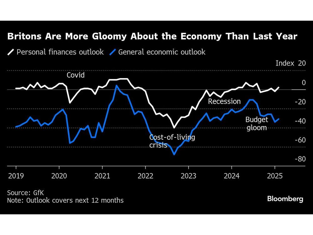 (Bloomberg) – Rumah tangga Inggris lebih suram tentang ekonomi daripada ketika Inggris muncul dari penurunan setahun yang lalu, sebuah pukulan bagi harapan Kanselir Rachel Reeves untuk memberikan pertumbuhan yang telah menghindari tenaga kerja di bulan -bulan pertama yang berkuasa.