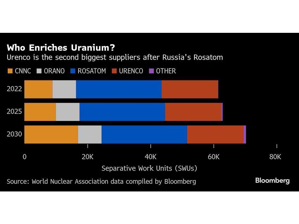 Urenco, kedua setelah Rosatom Corp Rusia dalam bisnis memisahkan isotop uranium yang dibutuhkan untuk tenaga nuklir, melihat pipa pesanannya tahun lalu membengkak lebih dari seperempat menjadi € 18,7 miliar ($ 20,4 miliar). Dengan lebih banyak negara yang mengejar pembangkit nuklir dan utilitas berputar dari rantai pasokan yang dikendalikan Kremlin, konsorsium Inggris-Dutch-Jerman melihat peluang baru.