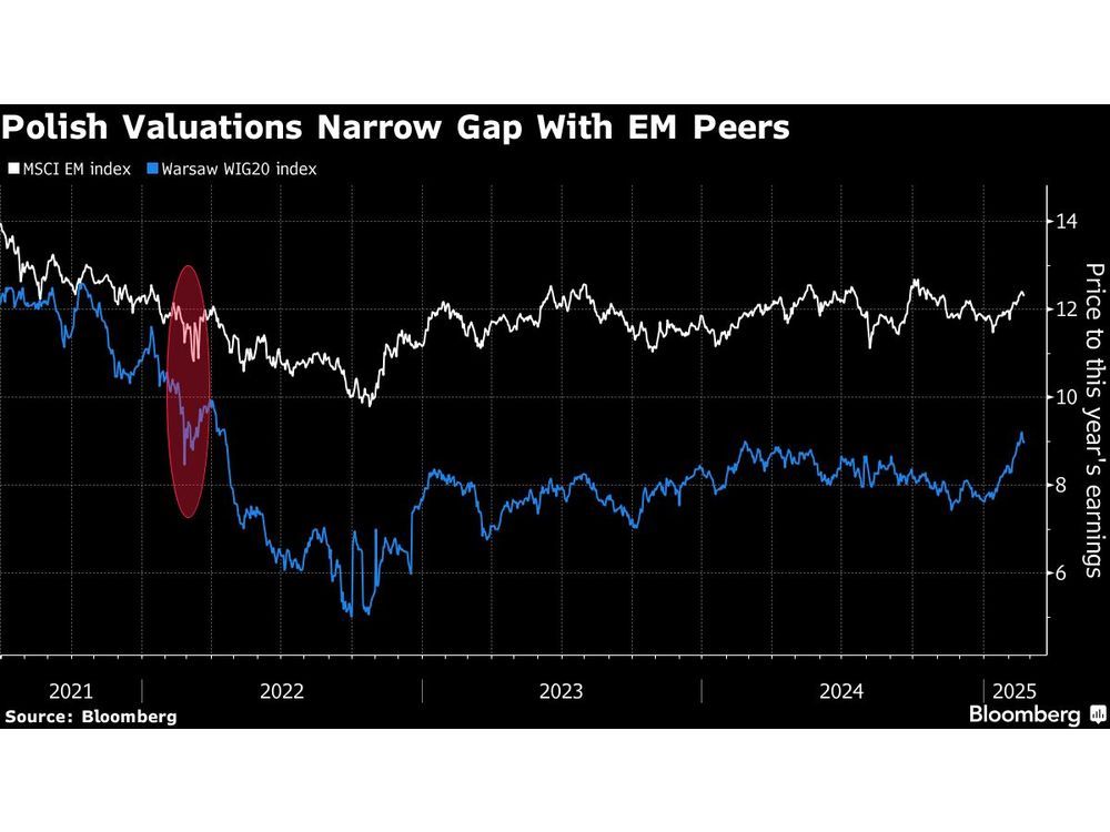 Rally berarti bahwa penilaian stok Polandia hampir menghapus penurunan yang mereka alami setelah dimulainya perang di Ukraina. Kesenjangan antara saham terbesar Warsawa dan rekan-rekan di pasar berkembang MSCI telah menyempit-dengan perdagangan WIG20 di sekitar kelipatan harga-ke-hasil dari sembilan, dibandingkan sekitar 12 untuk pengukur EM.